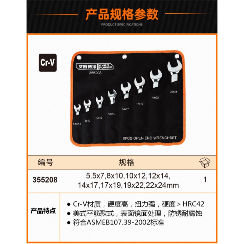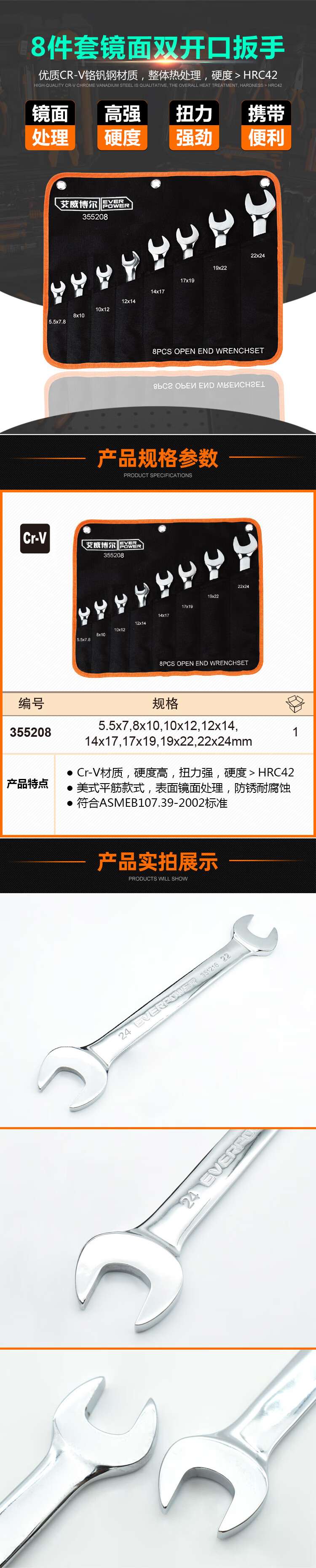 艾威博尔(EVER POWER) 355208 镜面双开口扳手组套 8件套 (单位:套)