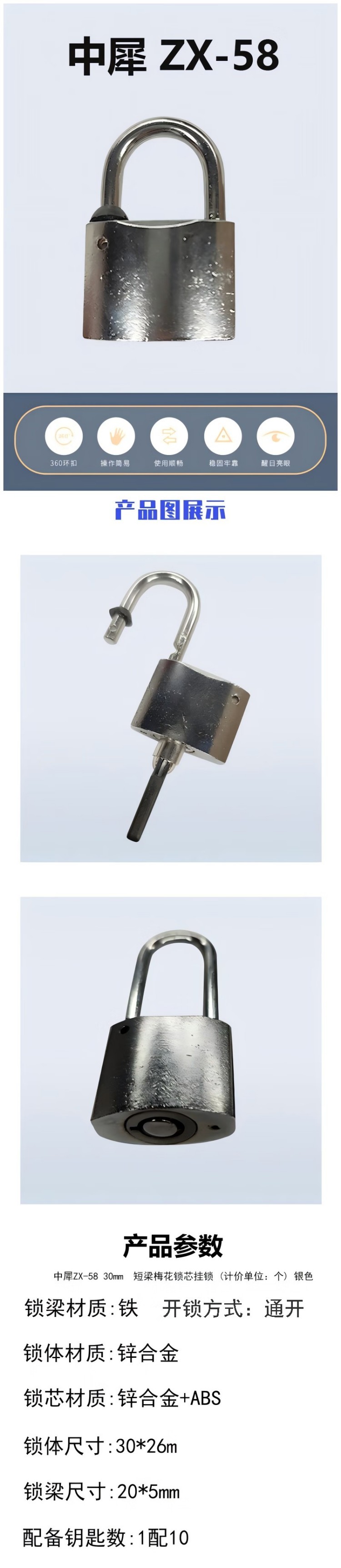 中犀 ZX-58 挂锁 30mm 短梁梅花锁芯 (单位:个) 银色