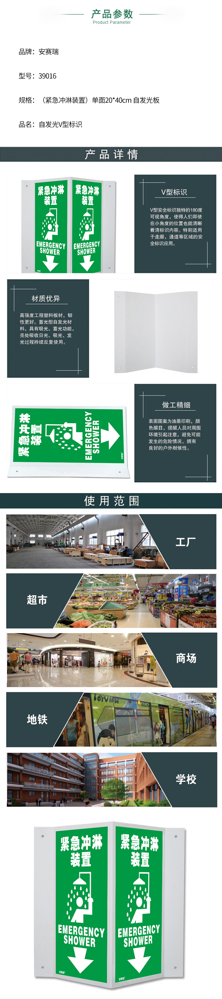 商品名称 自发光板自发光V型标识 紧急冲淋装置
