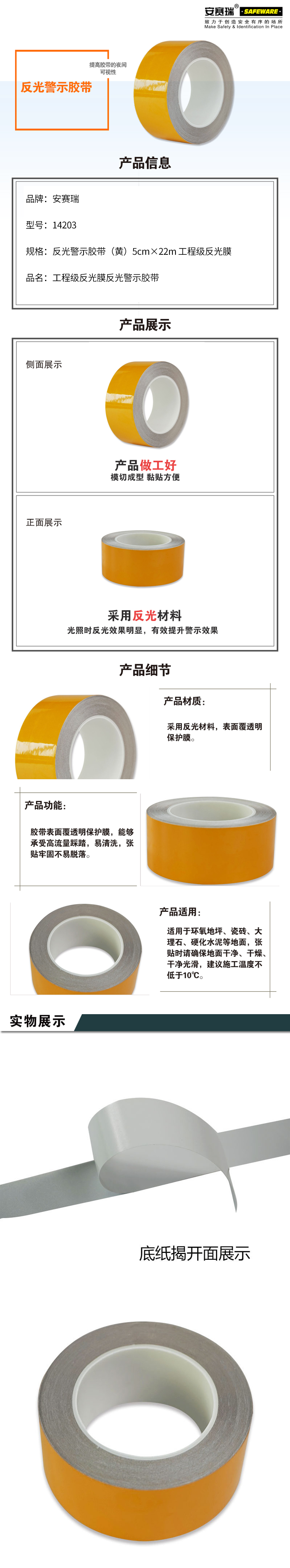 安赛瑞 14203 工程级反光膜反光警示胶带 5cm*22m (单位:卷) 黄色