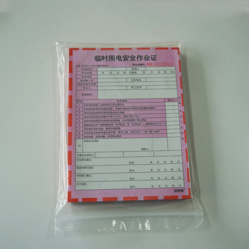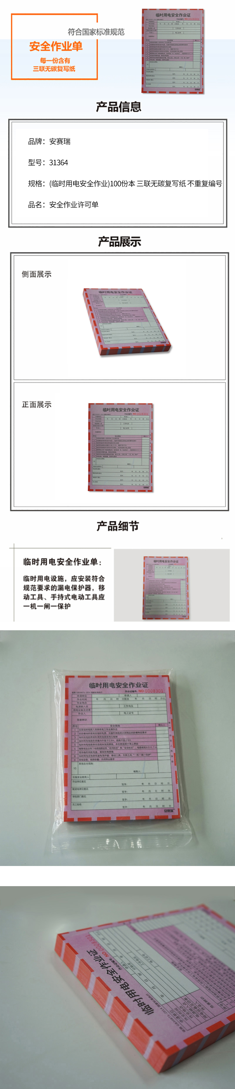 安赛瑞 31364 安全作业许可单 临时用电安全作业 100份/本 (单位:本)