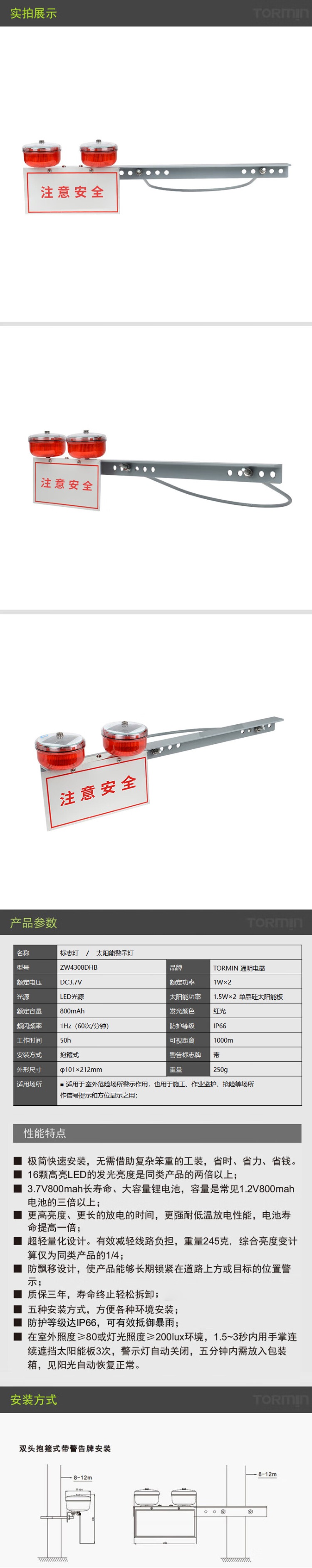 通明 ZW4308DHB 太阳能警⽰灯 1W*2 (单位:套) 红色
