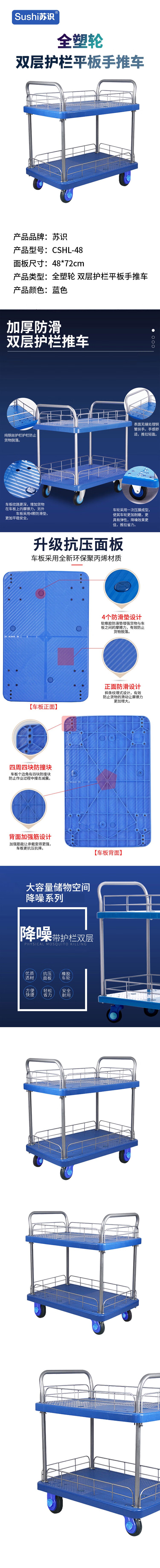苏识 CSHL-48 双层护栏平板手推车 48*72cm全塑轮 (单位:辆) 蓝色
