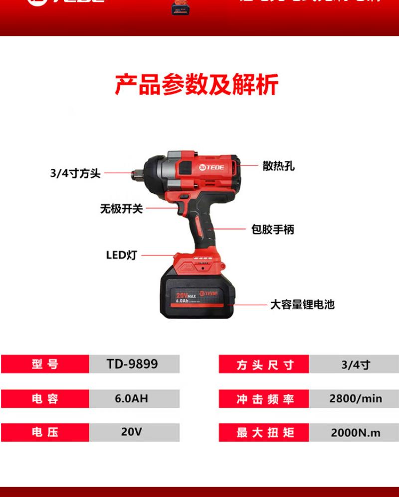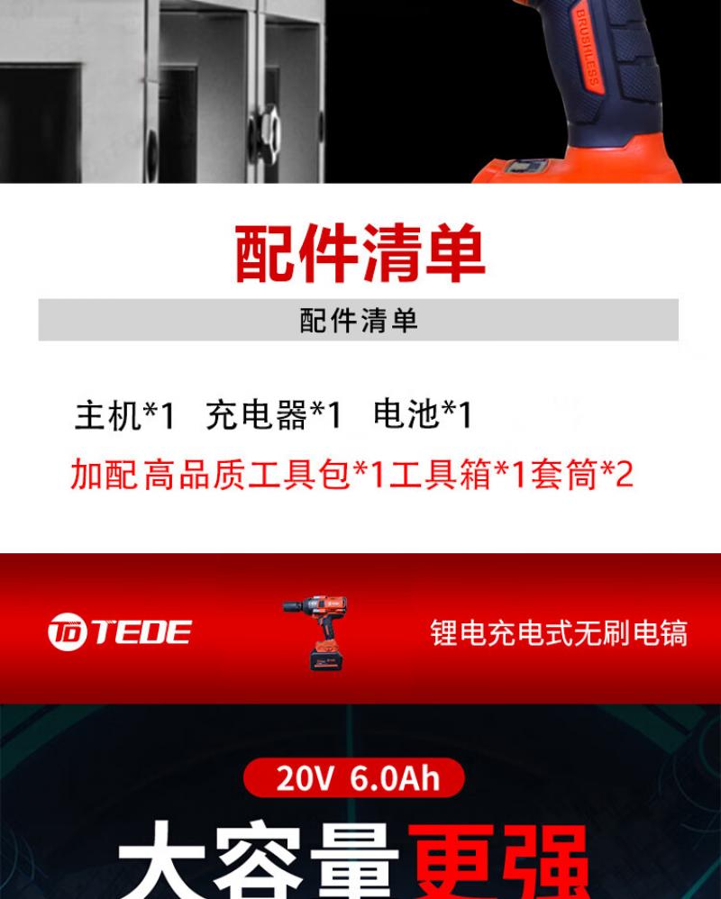 TEDE TD-9899 TEDE 3/4寸锂电充电式无刷电镐 一电一充 TD-9899 (单位:套) 一电一充 (单位:套)