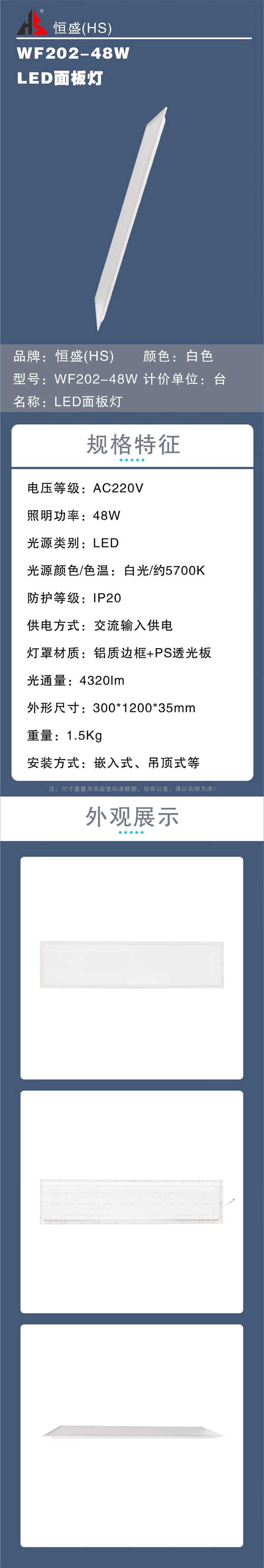 恒盛(HS) WF202-48W LED面板灯 48W (单位:个)