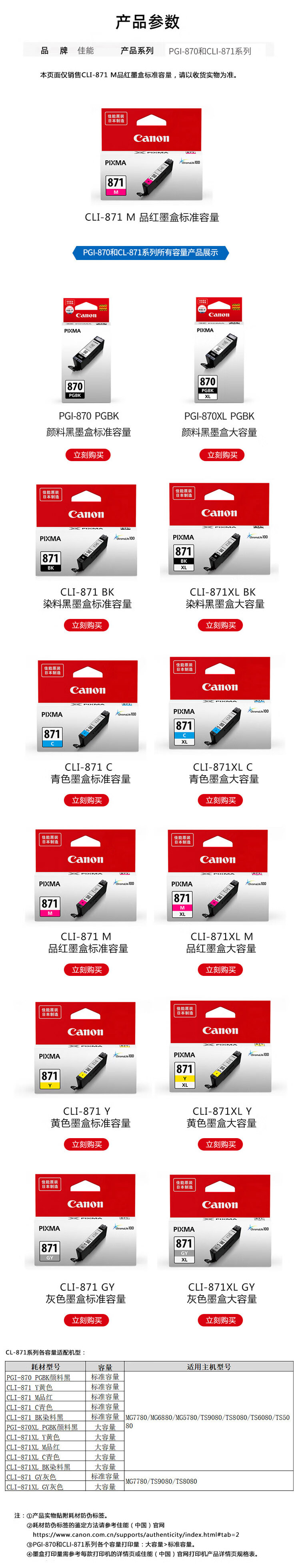佳能(Canon) CLI-871M 墨盒 172页 (单位:盒) 适用MG7780/TS9080/TS8080/TS5080 品红色