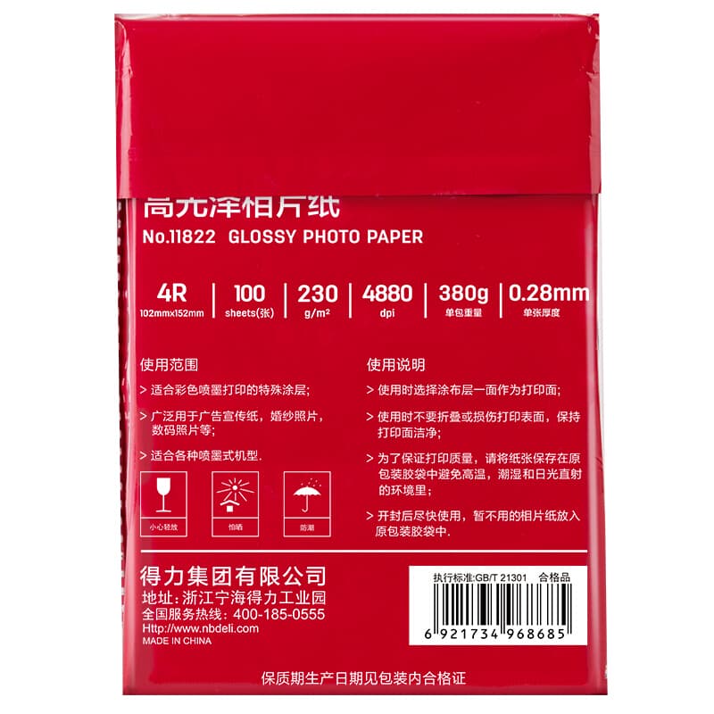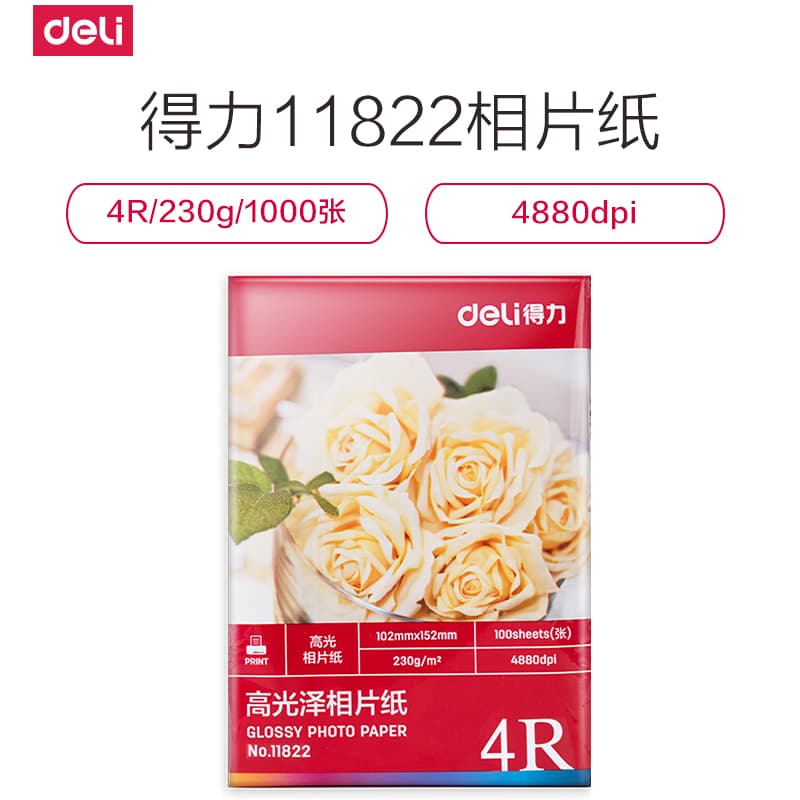 得力(deli) 11822 高光相纸 4R(6寸) 230g 100张/包 40包/箱 (单位:箱) 白色