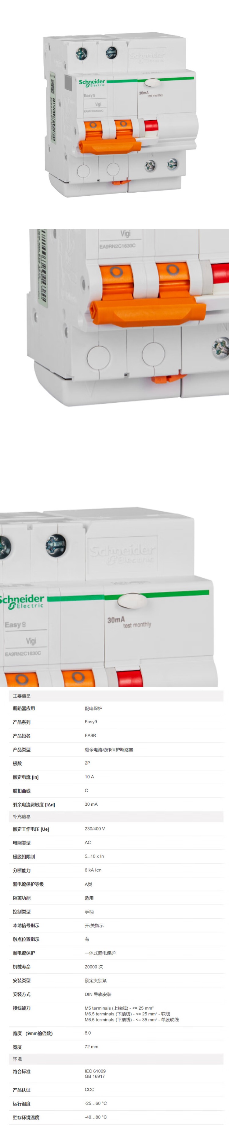 施耐德 EA9R 低压断路器 带漏保 2P C63A 30mA A类 6KA 230/400v (单位:只) 5个起订
