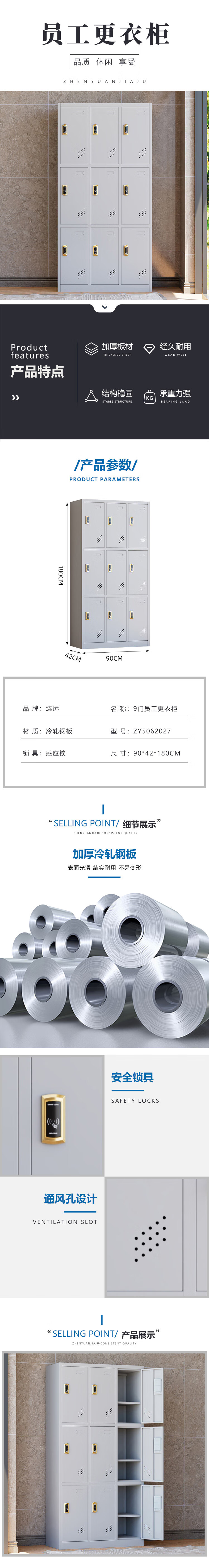 臻远 ZY5062027 铁皮更衣柜感应锁 九门 90*42*180cm (单位:台) 纯白