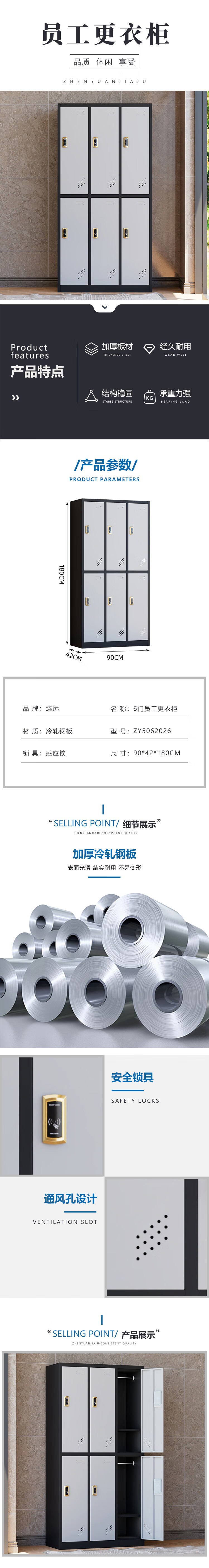 臻远 ZY5062026 铁皮更衣柜感应锁 六门 90*42*180cm (单位:台) 黑框白门