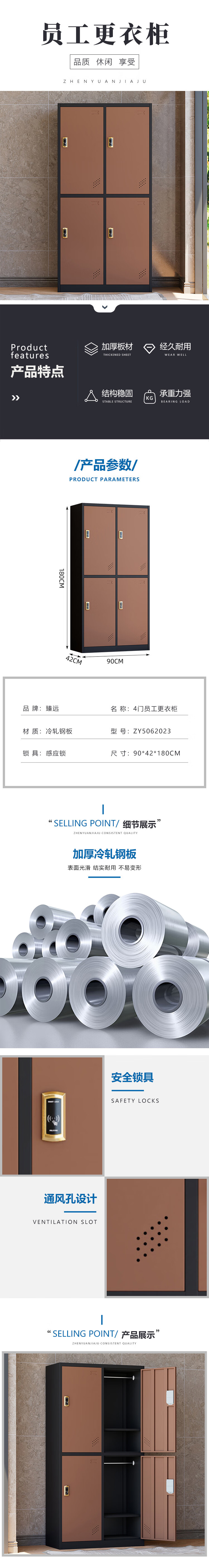 臻远 ZY5062023 铁皮更衣柜感应锁 四门 90*42*180cm (单位:台) 黑款咖门
