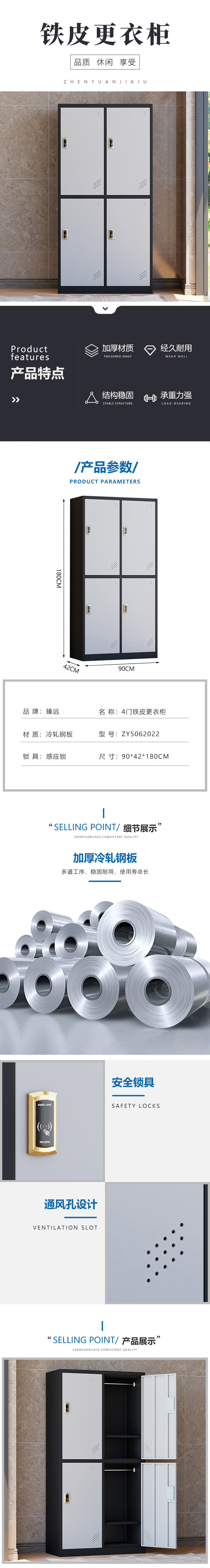 臻远 ZY5062022 铁皮更衣柜感应锁 四门 90*42*180cm (单位:台) 黑框白门