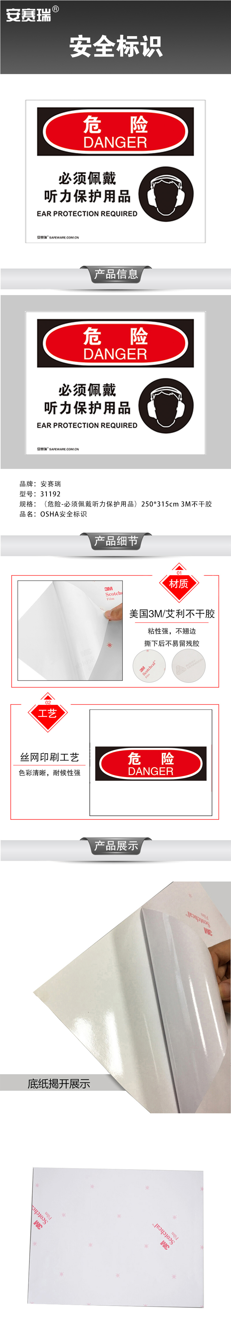 商品名称 3M不干胶OSHA安全标识 危险-必须佩戴听力保护用品