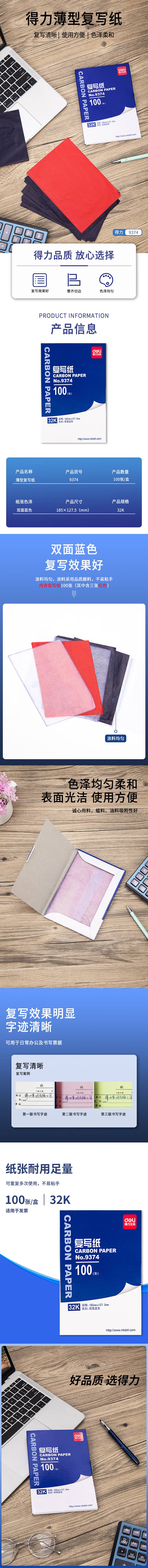 得力(deli) 9374 双面复写纸 32K 12.7*18.5cm 100张/盒 5盒/包 (单位:包) 蓝色