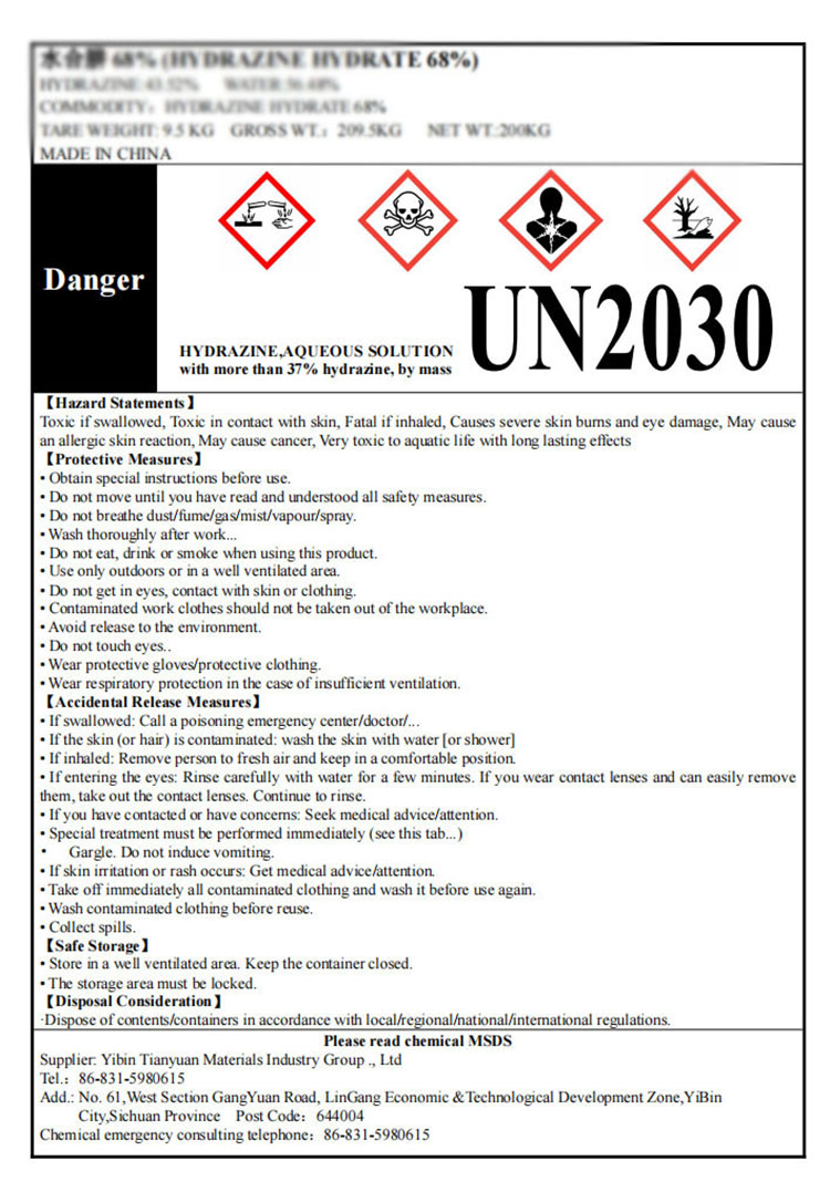 国产 激光不干胶 水合肼85%标签 210mm*148.5mm (单位:张) 亮光纸 英文 2000张起订