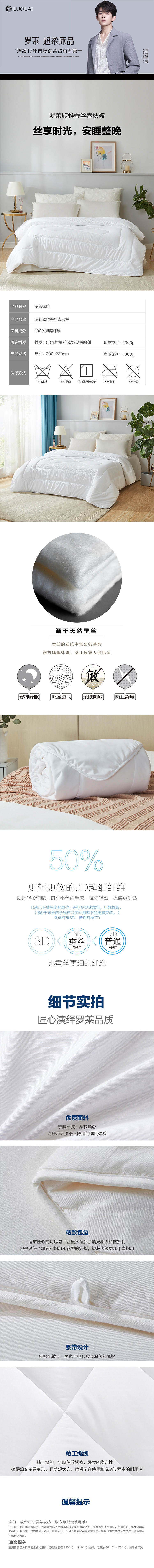 罗莱家纺LOVO 面料:100%聚酯纤维 填充材质:50%柞蚕丝(中长丝绵)50%聚酯纤维 尺寸:200*230cm 罗莱欣雅蚕丝春秋被 (单位:床) 罗莱欣雅蚕丝春秋被