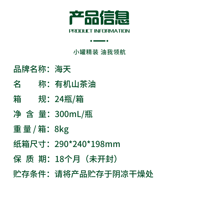 海天(HTDZ) 300ml 海天有机山茶油300ml尖叫瓶 (单位:瓶) 海天有机山茶油300ml尖叫瓶