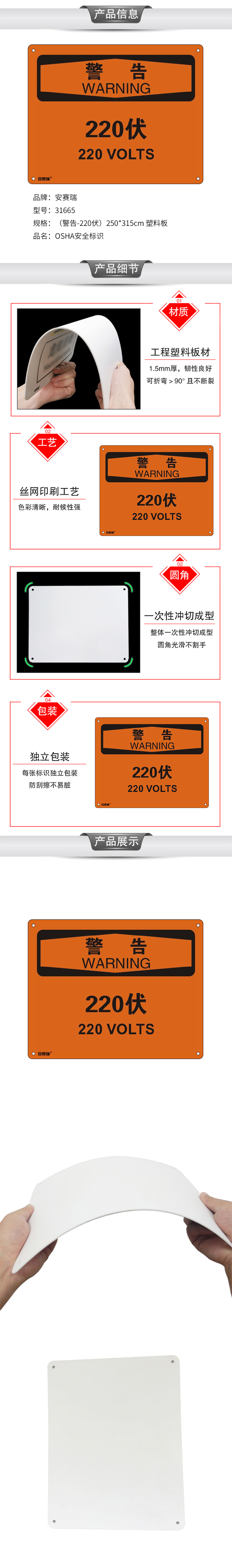安赛瑞 31665 塑料板OSHA安全标识 警告-220伏 250*315cm (单位:张)