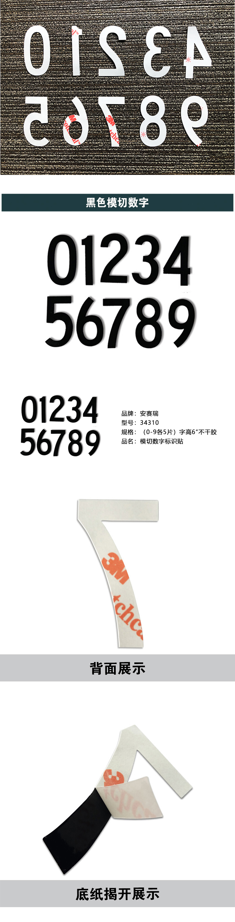 安赛瑞 34310 不干胶模切数字标识贴 0-9各5片 字高6″ (单位:套) 黑色