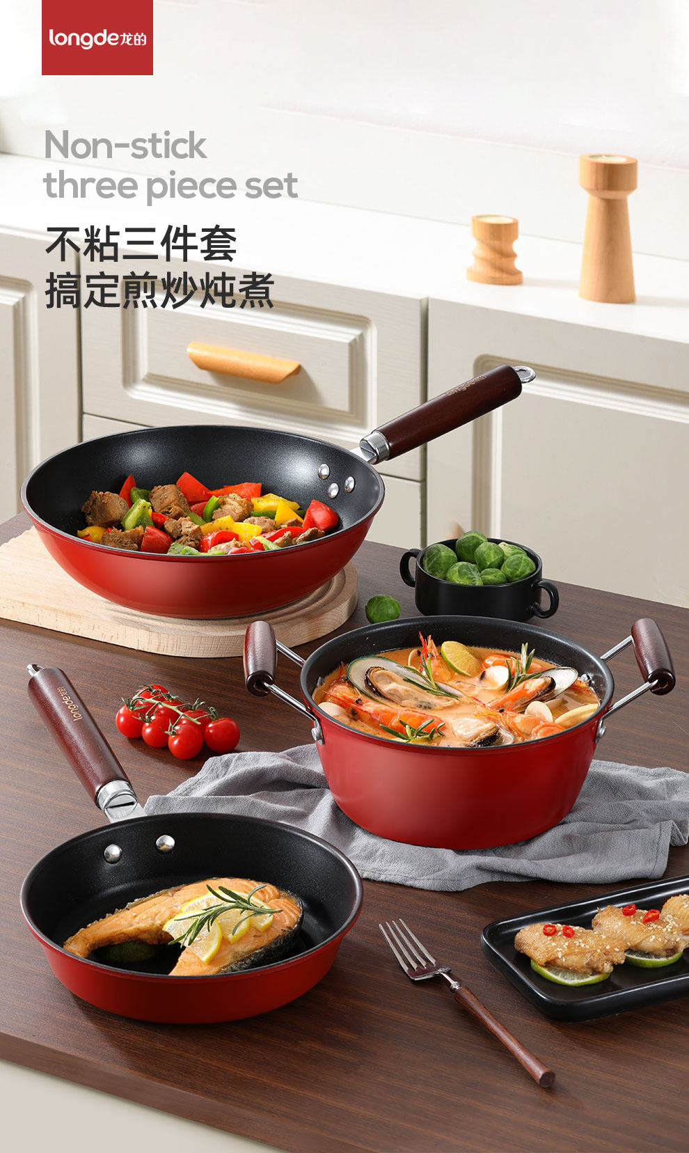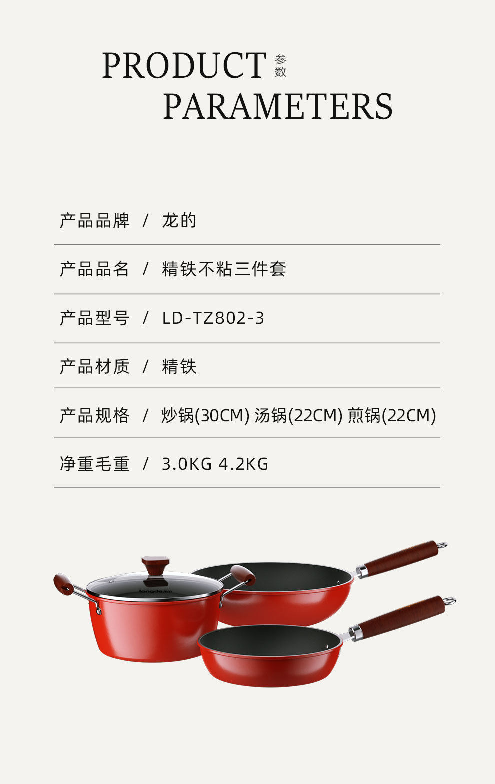 龙的(longde) 炒锅30cm、煎锅22cm、汤锅22cm彩盒包装;LD-TZ802-3 龙的悦享精铁 不粘三件套LD-TZ802-3-炒锅30cm、煎锅22cm、汤锅22cm彩盒包装;LD-TZ802-3 (单位:套) 龙的悦享精铁 不粘三件套LD-TZ802-3-炒锅30cm、煎锅22cm、汤锅22cm彩盒包装;LD-TZ802-3
