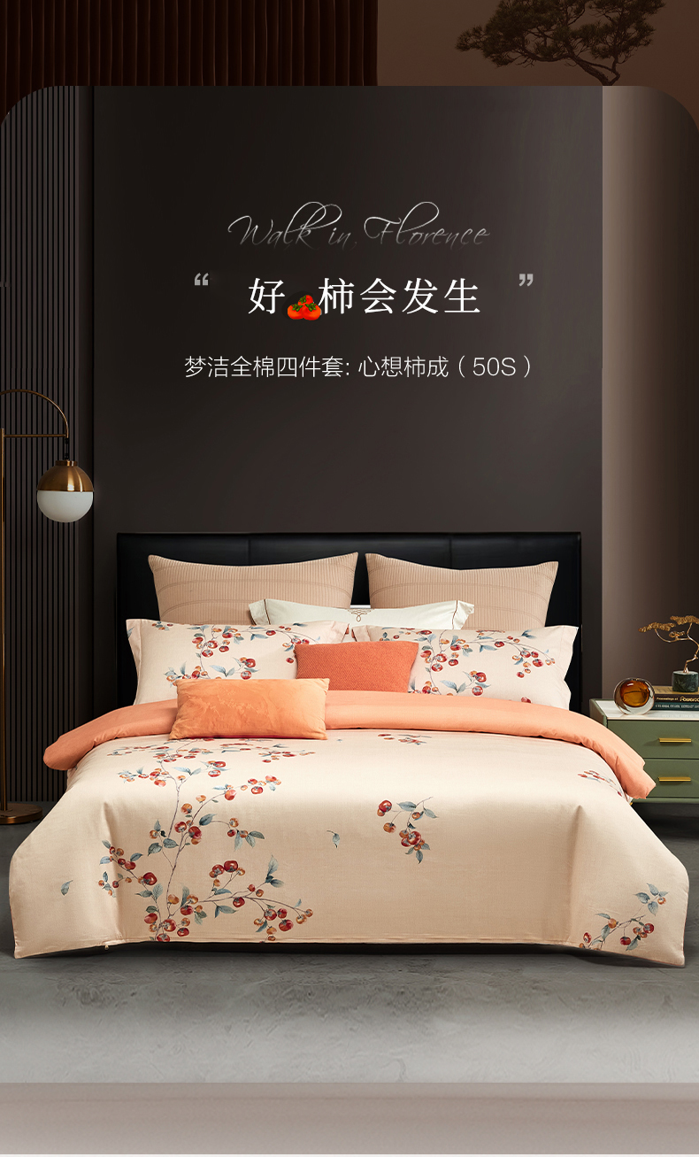 梦洁 型号:1010189094尺寸:被套200*230cm床单230*245cm枕套48*74cm 梦洁 50S纯棉印花四件套:心想柿成 1010189094 (单位:套) 梦洁 50S纯棉印花四件套:心想柿成 1010189094