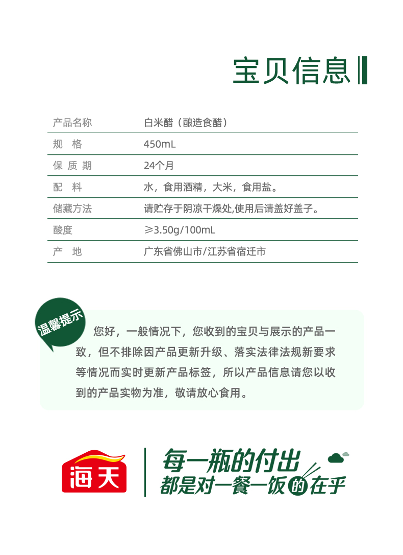 海天(HTDZ) 450ml 海天白米醋450mL*2瓶(中华老字号) (单位:瓶) 海天白米醋450mL*2瓶(中华老字号)