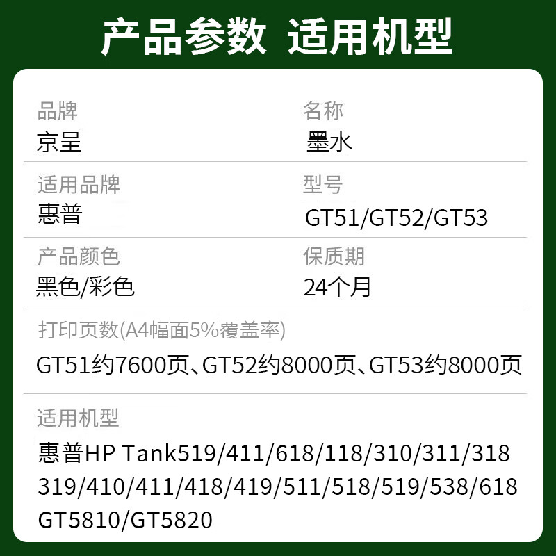 京呈 GT52 墨水 8000页 70ml (单位:支) 适用GT51惠普墨水HP310/410/5810/5820/418/411/518/519墨水 黄色