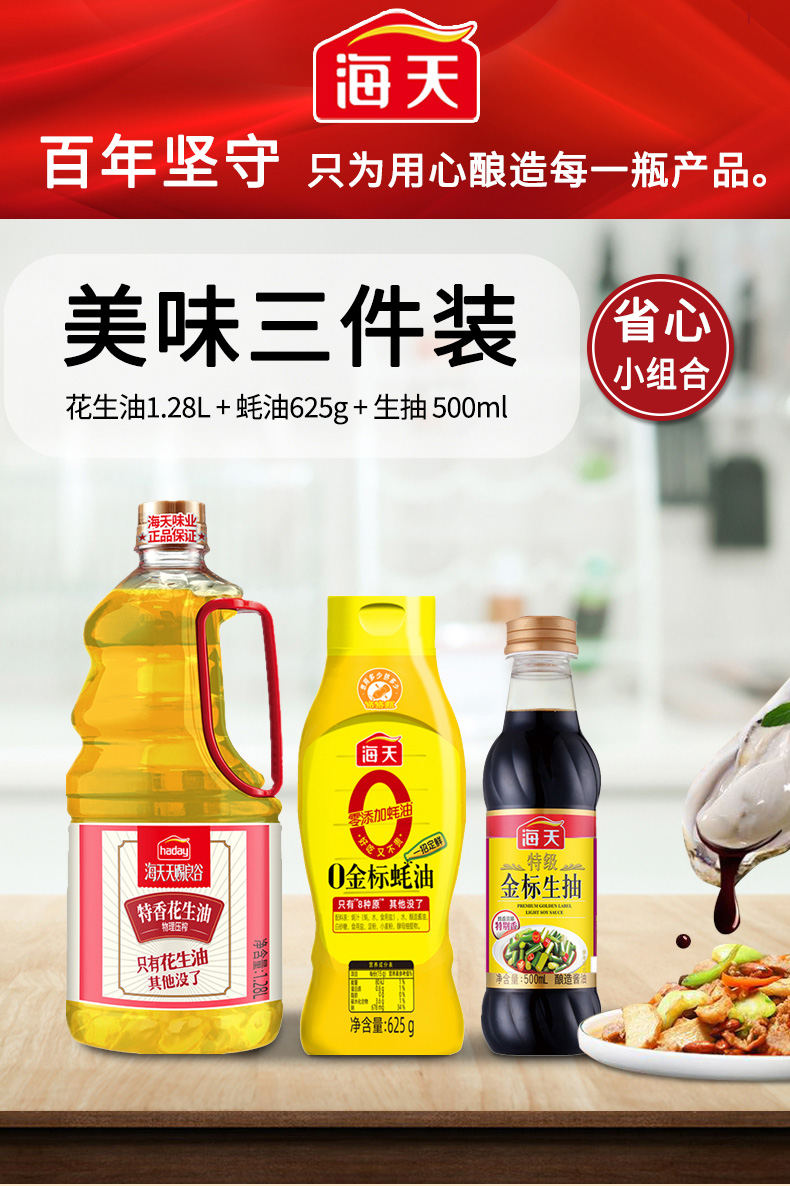海天(HTDZ) 组合装 海天厨房调味组合装(花生油1.28L+特级金标500ml+0金标蚝油625g) (单位:套) 海天厨房调味组合装(花生油1.28L+特级金标500ml+0金标蚝油625g)