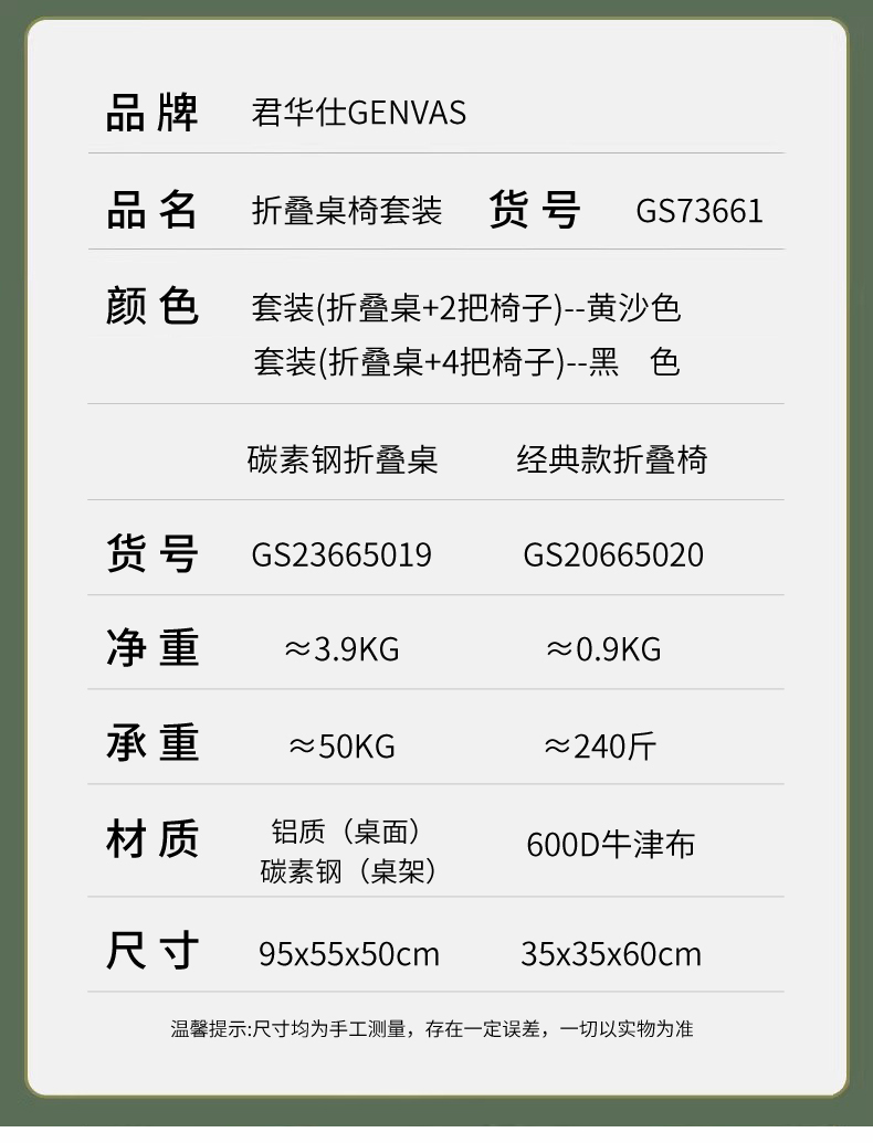 君华仕(GENVAS) 材质:铝质(桌面)碳素钢(桌架) 600D牛津布、碳素钢支架 君华仕 GENVAS一桌四椅(五件套) (单位:件) 君华仕 GENVAS一桌四椅(五件套)