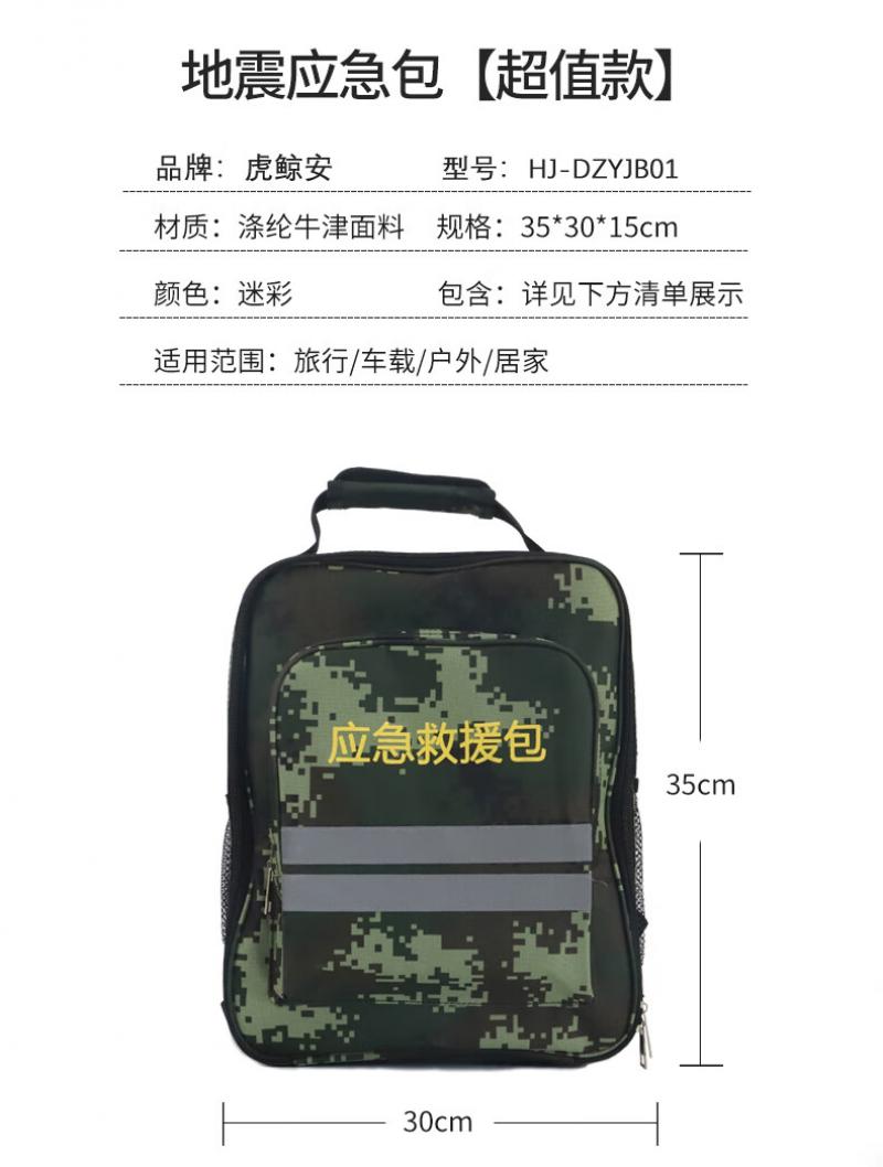 虎鲸安(HJ) HJ-DZYJB01 虎鲸安 HJ-DZYJB01 消防防灾包 地震救援包 地震应急包 超值款 单位:套 (单位:套)
