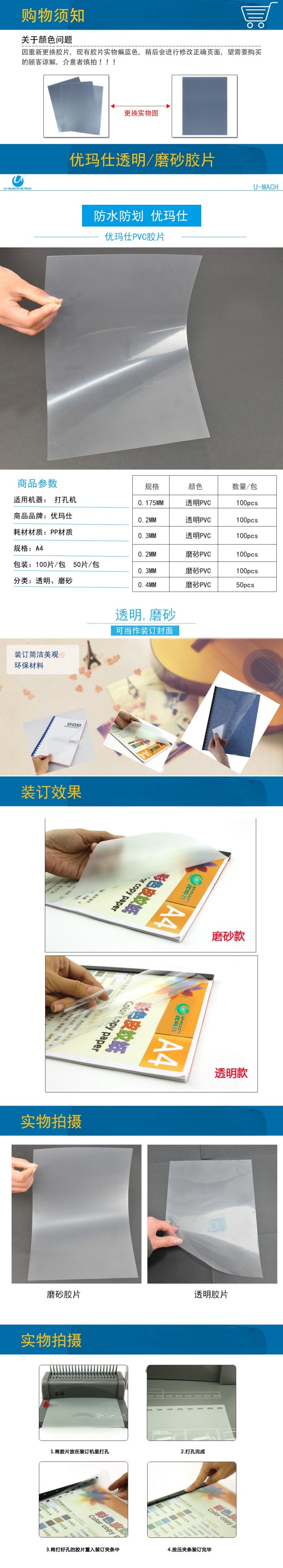 优玛仕 A4 0.3mmMS 装订磨砂胶片 0.3mm 100张/包 (单位:包) 白色/蓝色