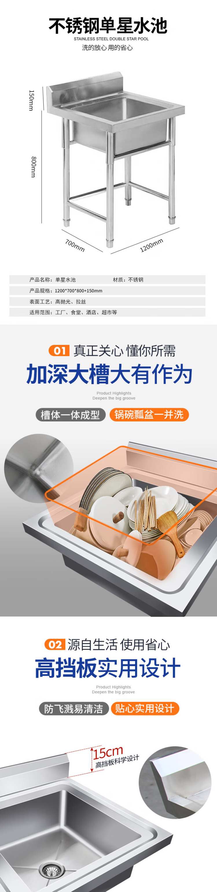 安立洁康 单星 不锈钢水池 1200*700*800+150mm (单位:个)