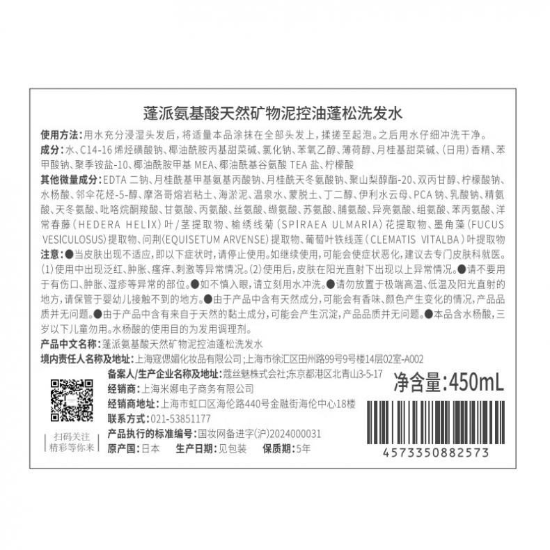 蓬派(CLAYNAL) 氨基酸天然矿物泥 控油蓬松洗发水 450ml (单位:瓶)