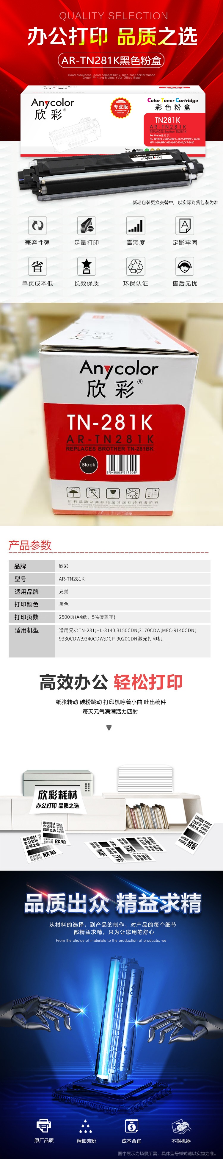 欣彩(Anycolor) AR-TN281BK 粉盒 专业版 2500页 (单位:支) 适用兄弟3170CDW 3150CDN 黑色