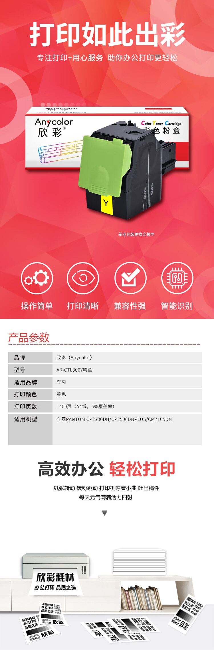 欣彩(Anycolor) AR-CTL300Y 粉盒 1400页 (单位:支) 适用奔图CP2300DN/CP2506DN PLUS/CM7105DN 黄色