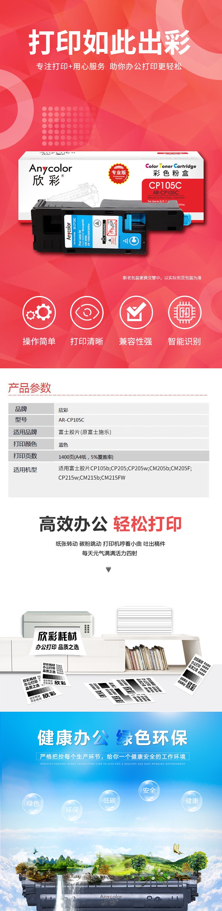 欣彩(Anycolor) AR-CP105C 粉盒 专业版 1400页 (单位:支) 适用施乐CP105b 205b 蓝色