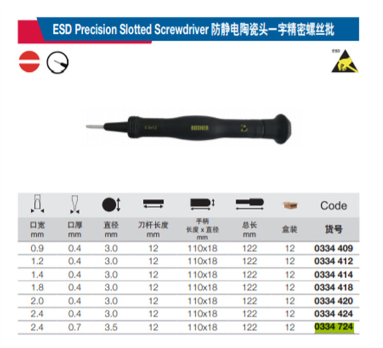 宝合(BOOHER) 0334418 防静电陶瓷头一字精密螺丝批 1.8x12MM(单位:支)