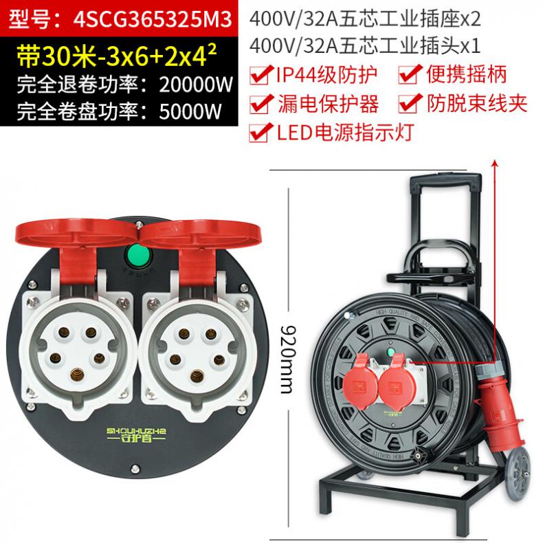 守护者(SHOUHUZHE) 4SCG365325M3 移动电缆盘电源盘 380V~400V-3*6mm²+2*4mm²*30米(单位:个) 2位32A5孔 黑色