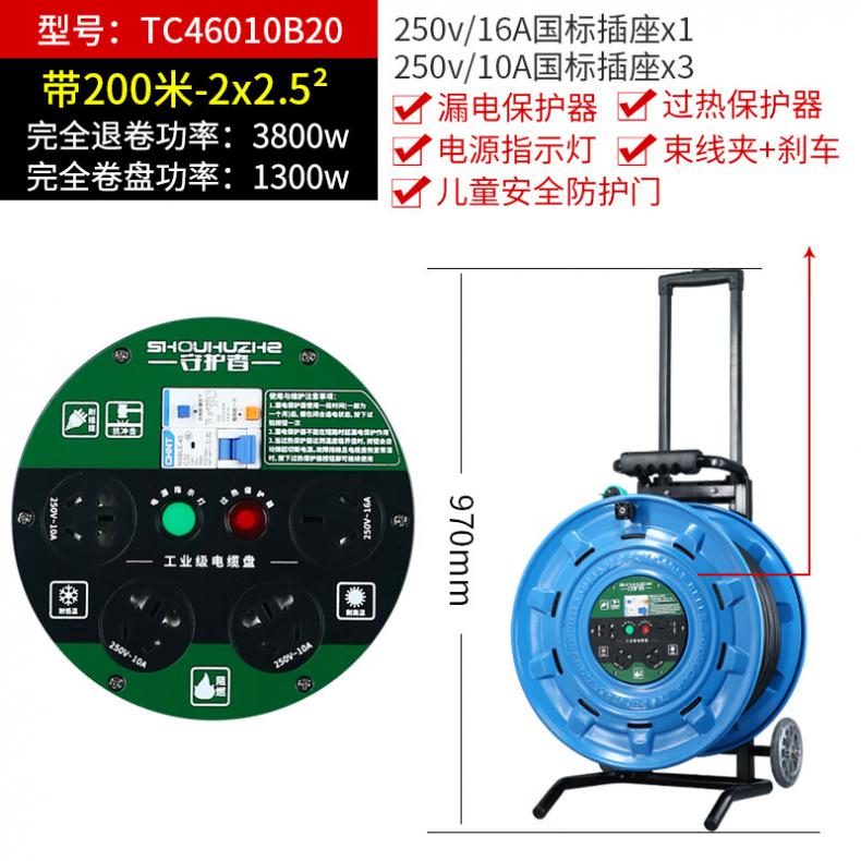 守护者(SHOUHUZHE) TC46010B20 移动电缆盘电源盘 220V~250V-2*2.5mm²*200米(单位:个) 3位10A5孔+1位16A3孔 蓝色