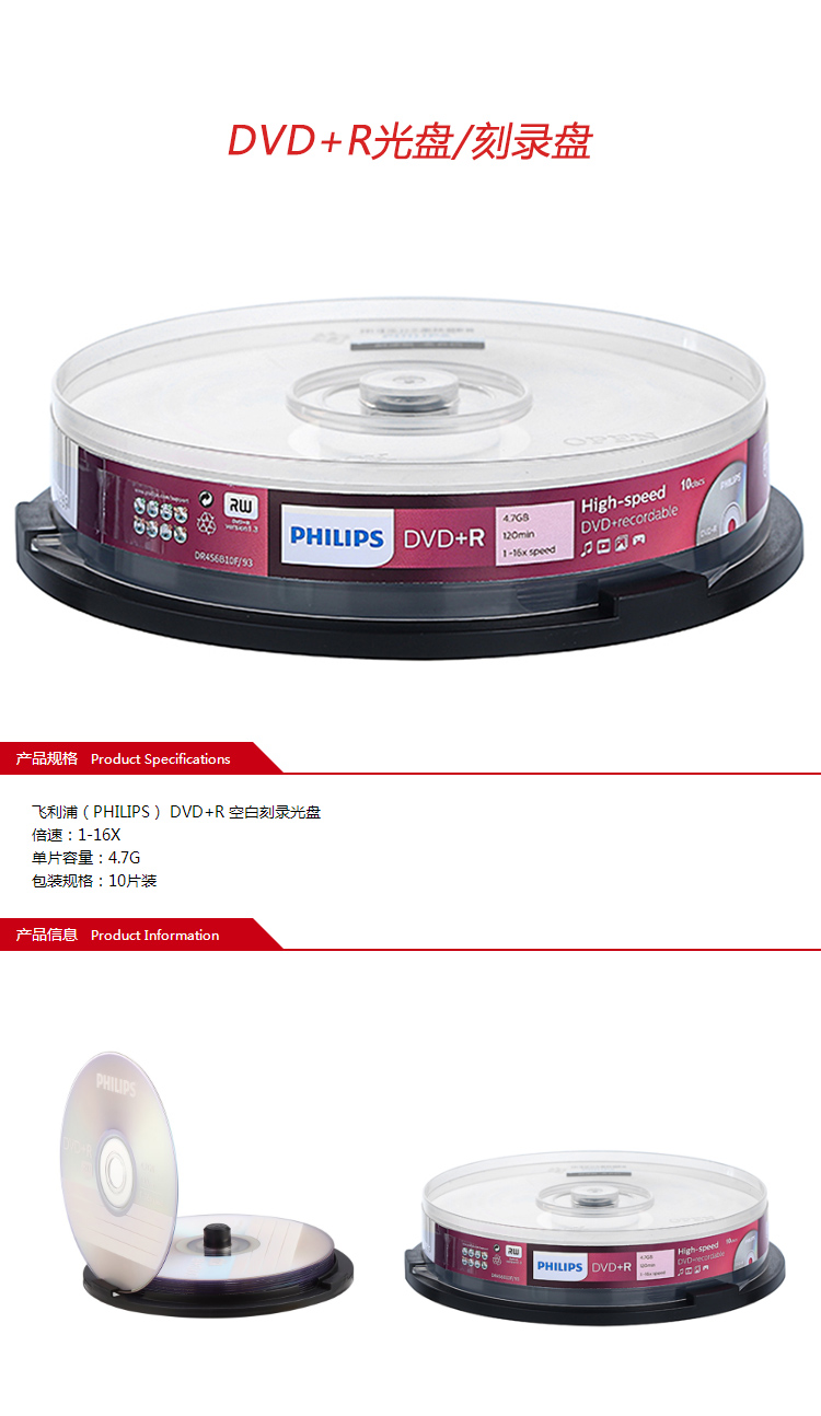 飞利浦(PHILIPS) DVD+R 刻录光盘 16速4.7G 10片/桶(单位:桶)