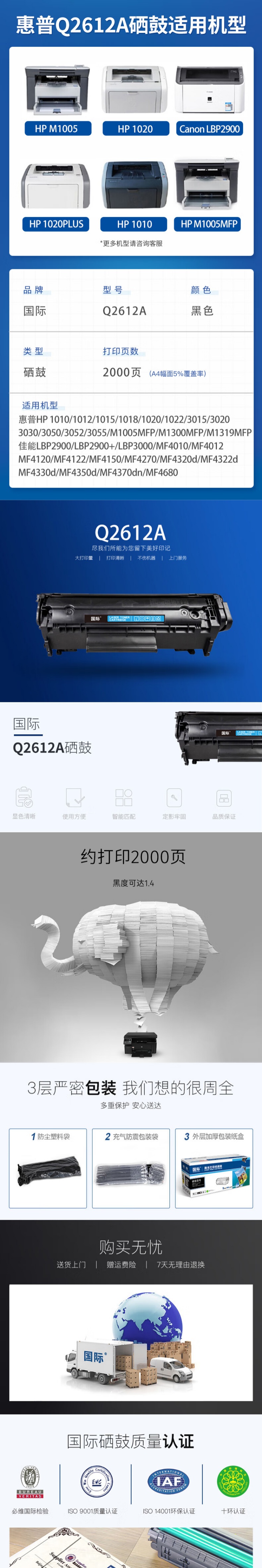国际 Q2612A 高容量硒鼓 2000页 (单位:支) 适用HP惠普1010/1015/1020/1022/3015/3020/3030/M1005MFP/M1319MFP 黑色