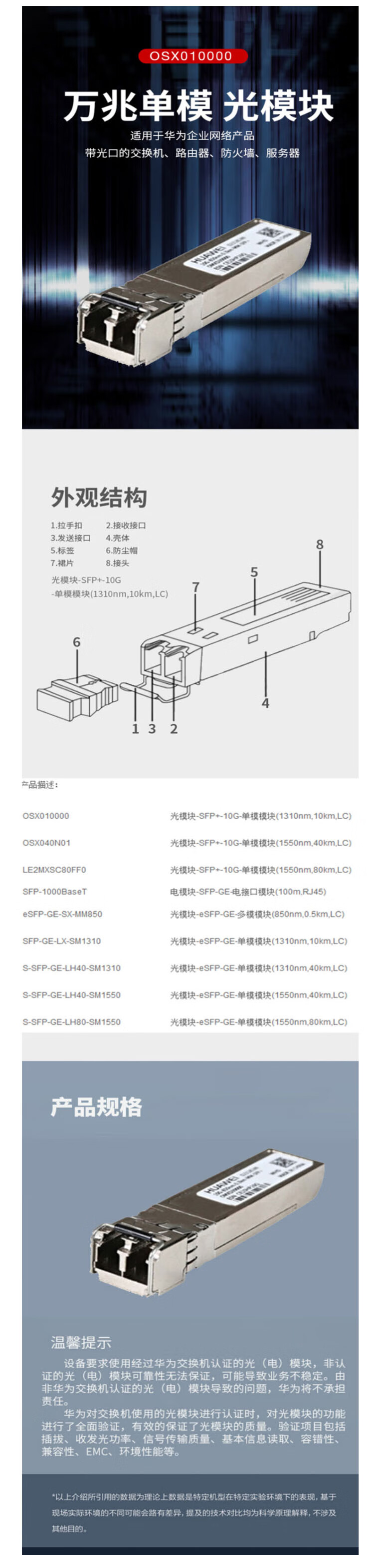 华为(HUAWEI) OSX010000 万兆光模块 SFP+ 10G 单模模块(1310nm,10km,LC)(单位:个)